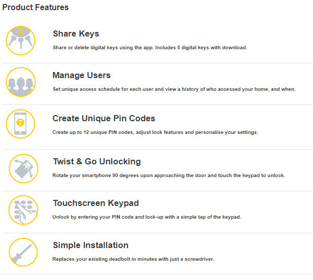Controlled via the Yale Assure App, Yale’s “Twist and Go” function allows users the unique ability to unlock their door by twisting their smart phone when within Bluetooth range. The “Twist and Go” feature protects you and your family from unintended unlocking. Also offering a backlit touch screen keypad, users have the option of entering a PIN code to unlock the door.